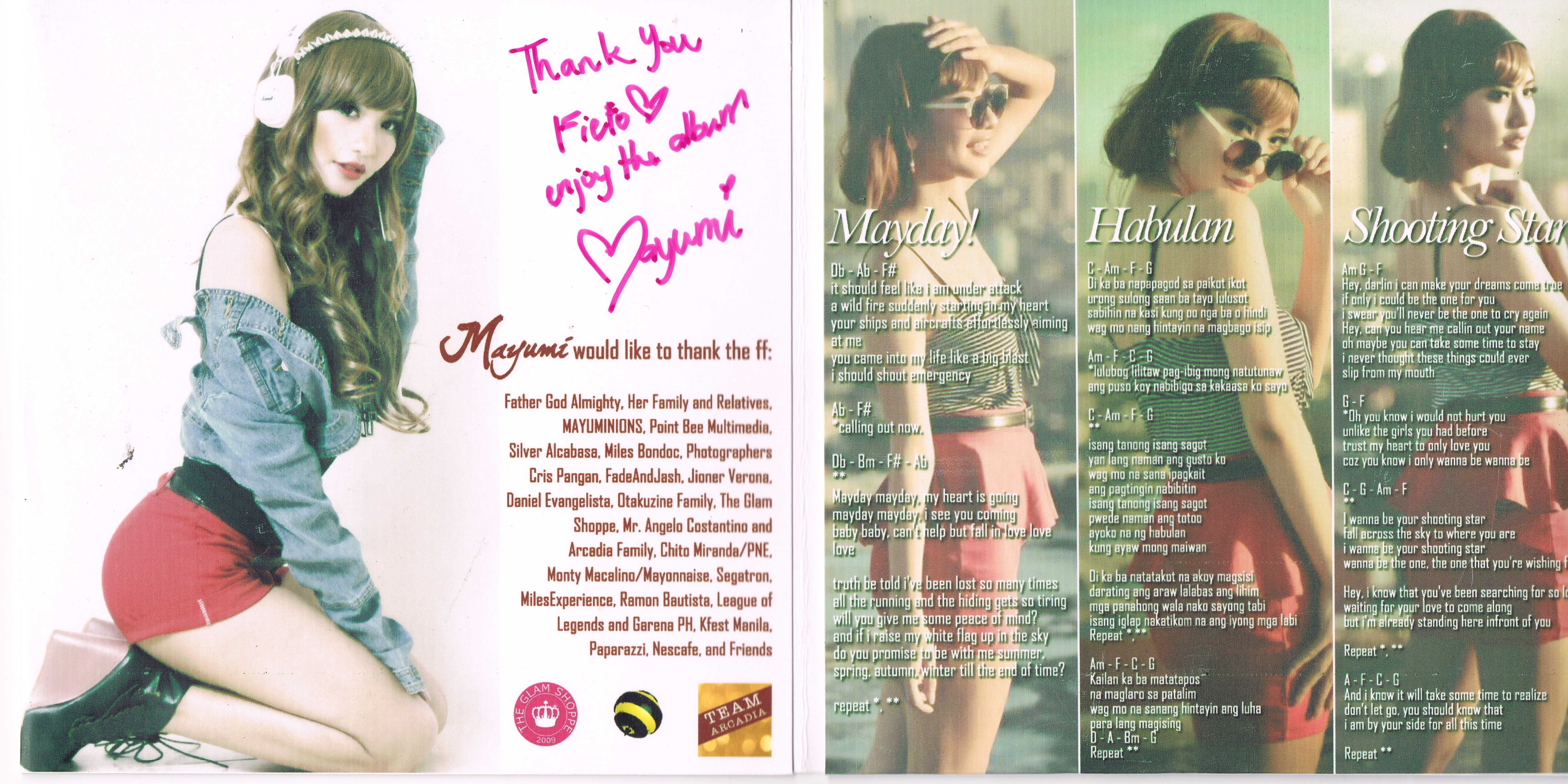 But the reason why you buy the album is to actually listen to the songs, right? Mayumi: The First Mini Album has a total of six tracks, but there are only three original songs. The songs are Mayday!, Habulan and Shooting Star; the other three songs are actually acoustic versions of the originals.