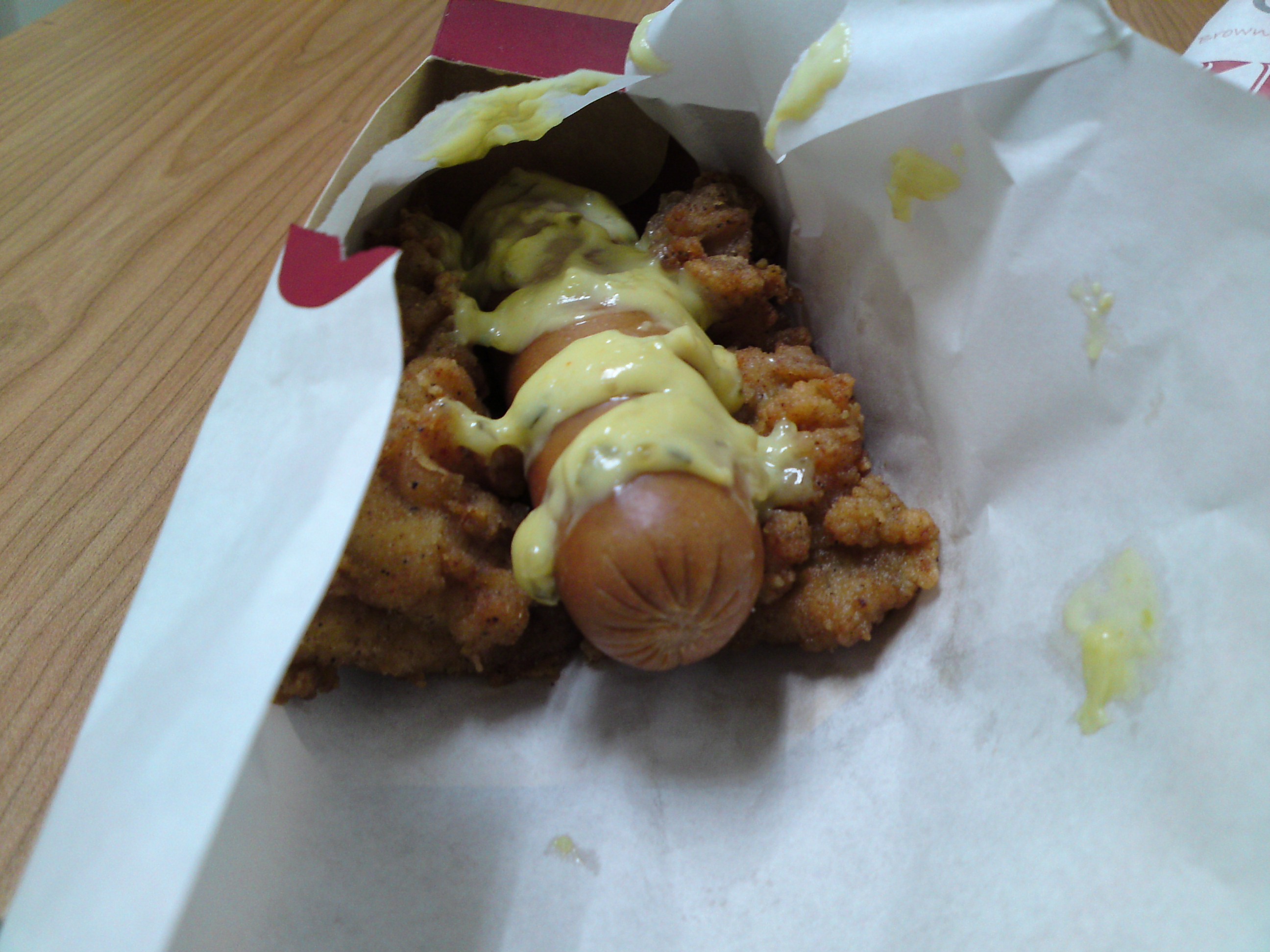 But I do have to say that it’s difficult to eat! I was kind of pissed that the Double Down Dog came in a box and wrapped in paper as it made it very difficult to get a decent picture of the thing and a bother to eat as they got in the way of easy consuming. But, apparently, there’s a reason why it comes in a box: it’s to keep everything contained! I made the mistake of removing it from the box. Around my third bite the hot dog slipped out from between the chicken fillet! Luckily, the hot dog landed in the box so I was able to put it back on top of the fillet and continue eating.