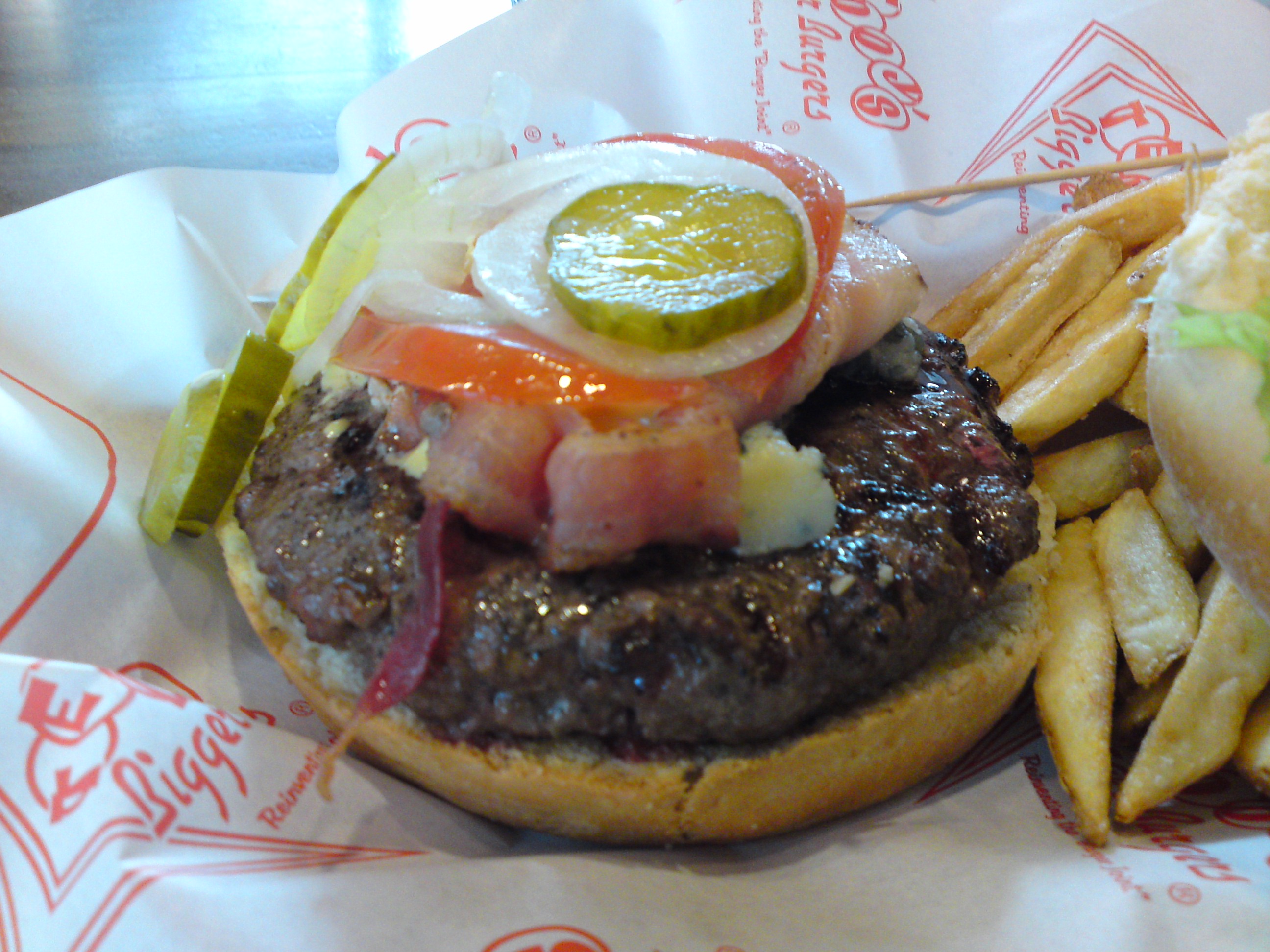 I wasn’t particularly adventurous this time around. After all, I’ve been passing by this place for so long, I didn’t want my first experience eating at Teddy’s to be possibly ruined because I ordered something too exotic. But, at the same time, I didn’t want to play it too safe and just order the plain ol’ cheeseburger. There was one thing that I felt was a good middle ground between too “exciting” and too “boring.” That would be the Bleu Cheese Bacon Burger because of the “exotic” bleu cheese and, well, bacon is always a safe bet, right? Of course, I had to order it with a side of fries because what’s a burger meal without fries?
