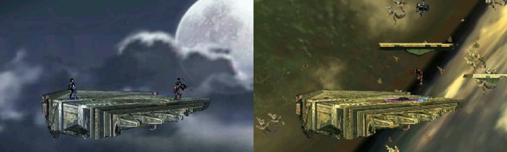 Bayonetta’s stage is called the Umbra Clock Tower and represents stages from both the original Bayonetta and Bayonetta 2. The stage consists of a single main platform that looks like the face part of a clock tower in free fall. As the match goes on this platform routinely pauses in midair, after which several smaller ledges appear into place. These ledges appear in different positions around the main platform (sometimes even below it), are of random lengths and some even move from left to right, giving the stage a dynamic feel.