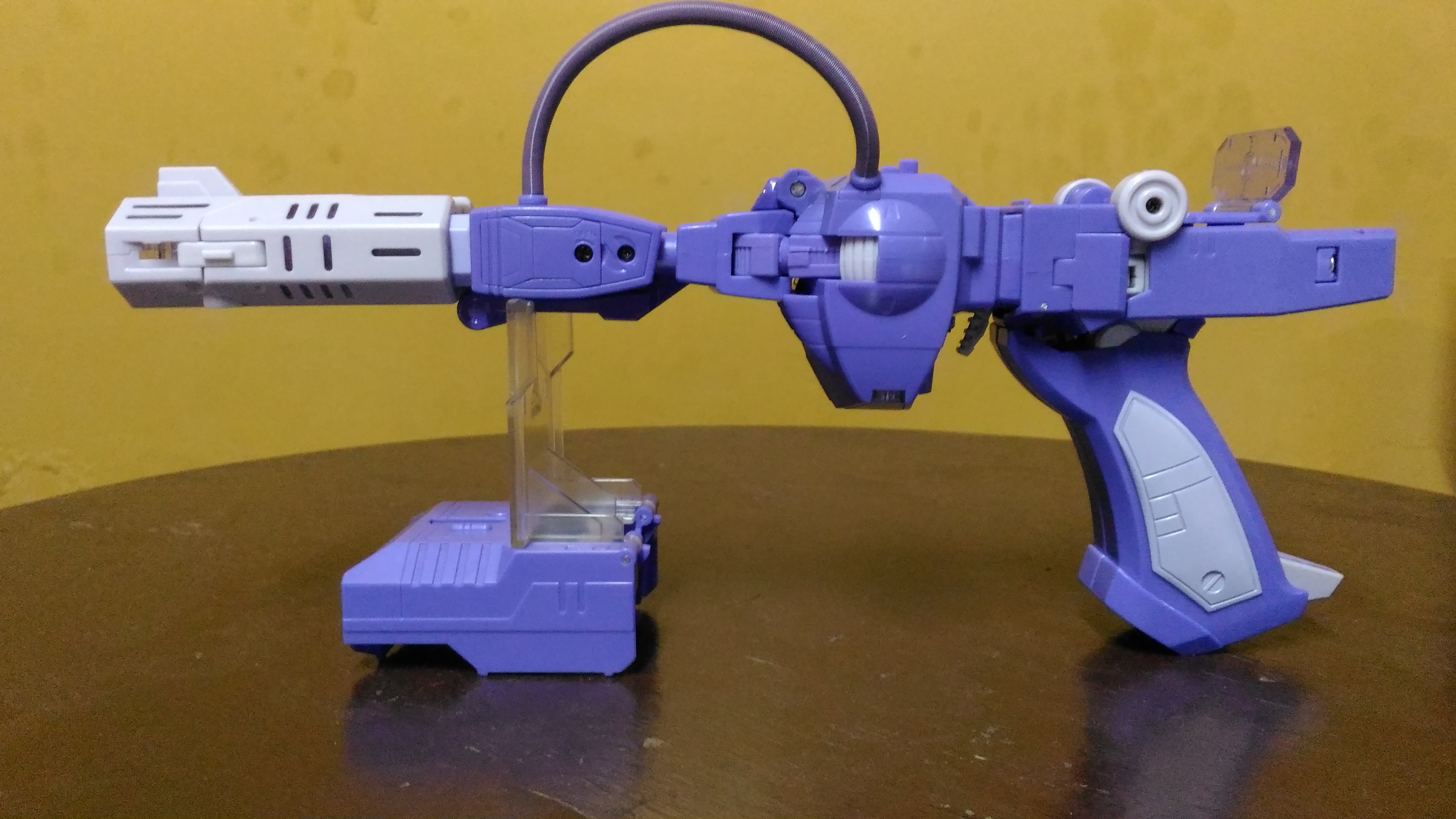 The muzzle actually folds up into his backpack. It’s definitely not cartoon accurate but, you know what? It actually doesn’t look half bad! It certainly doesn’t look like he jammed his muzzle into his back as there is some transformation involved. Also, you don’t need to detach it from the figure as there’s this really long die cast arm connecting it to the rest of the body. Oh, but if you really want Laserwave to look like Shockwave from the cartoon, you can still do that! If you look at the pictures above featuring the figure in his gun mode, you’ll notice a little stand. Well, the stand serves a double purpose as you can fold it up so it covers the muzzle really nicely! Win-win!