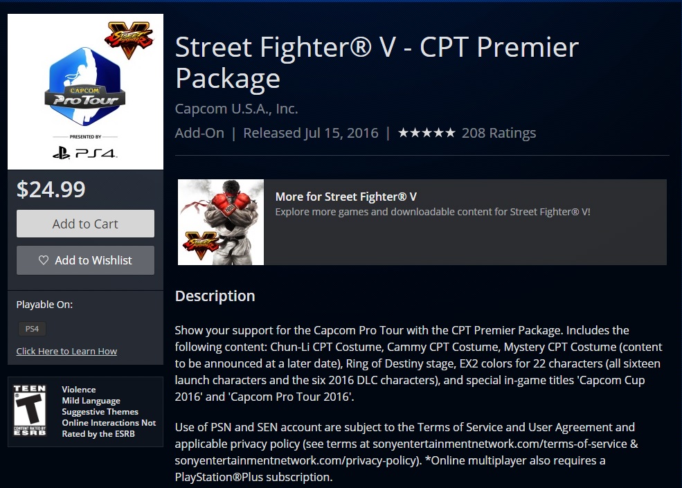 Now, some of the proceeds of each purchase will be added to the pot of the Capcom Cup finals to be held later this year. But $25? That’s an incredibly steep price and fans weren’t happy about it! People raged about how this is essentially highway robbery and dangling the idea that some of the proceeds will “go to charity,” so to speak, is just playing dirty. Well, I’m not sure how much Capcom is raking in from the sales of the Capcom Pro Tour Premier Package due to the negative outcry over it. But I did want to see if it was worth the expense. And, since I just so happened to have some money on my PlayStation Account that I wasn’t using, I decided to take the plunge and purchase the entire thing for myself!