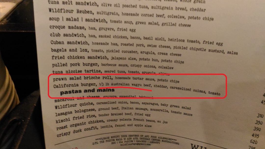 As this is the last week for Burger Month for the year, I wanted it to be special. I wanted it to be not just your regular burger and something to close out the month with a bang. I was wracking my brain thinking of a local burger joint that served something rather unique, I just so happened to stumble upon a Wildflour branch. I’ve never actually eaten at Wildflour before. No real reason as to why not; I just never gotten around to doing so. Which is why it was strange why I decided to check out its menu.