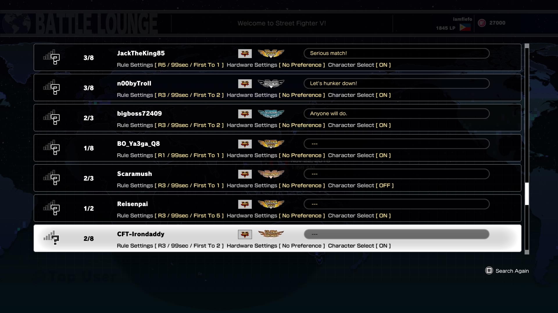What’s the result of this? Well, a general lack of matches and practice against online opponents. There are times when I’m just itching for a Ranked match and I would go through an entire hour without getting a single match! I switch to looking for Casual online matches and I still get bupkis! I then try to look for a Battle Lounge… and all I’ll get are those rows and rows of players that are enjoying online matches but I know I won’t enjoy entering those lobbies as they all have question marks next to the connection quality! It’s like Street Fighter V’s Battle Lounges are questioning my very ability to connect and play the game!