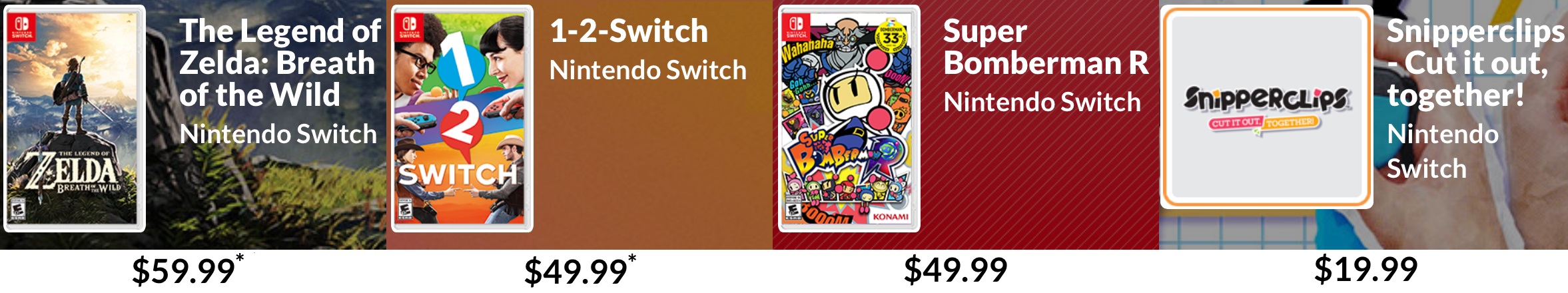 Pricing for Nintendo Switch games vary depending on whether it’s a full retail title or a digital-only release. It looks like retail releases will have a price ranging from $49.99 to $59.99, so you’ll need to make sure that you prepare at least $60 per software title that you’re interested in getting. A majority of Switch early adopters will probably get The Legend of Zelda: Breath of the Wild, so let’s add $59.99 to the total cost.