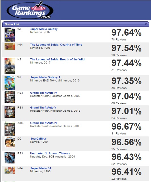 Some may argue that Metacritic’s method of aggregating review scores is flawed or incorrect, but that score of 99 essentially means that almost all the professional critics who reviewed The Legend of Zelda: Ocarina of Time gave it a highly positive review. If Metacritic’s rating isn’t enough to convince you, then we can look at GameRankings: