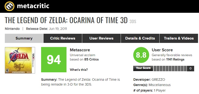 The Legend of Zelda: Ocarina of Time remains to be Metacritic’s highest rated video game of all time.