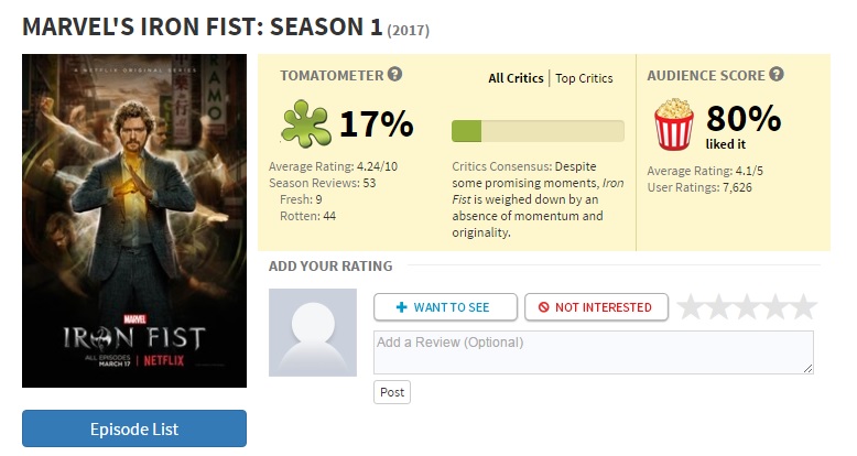 Based on these two reasons, I truly think most of the negative reviews should be inconsequential and disregarded. But the Rotten Tomatoes website doesn’t know it, so the score will stay. Hopefully, when I finish Netflix’s Iron Fist, I can be one of the few people to give it a positive review. I’m not particularly hopeful because those 5 episodes I’ve seen were a tough slog. But I will be man enough to reserve judgement on the show until I do see all 13 episodes and not a minute sooner.