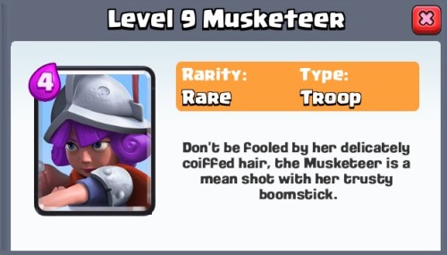 The Musketeer is your main damage dealer on defense in the Hog Trifecta deck. Only two units have a longer range than her (Princess and Dart Goblin), and she makes up for it by dealing more damage (per attack and per second) and having more health allowing her to survive hits from The Log, Arrows and same level Fireballs. A Musketeer that survives on defense becomes a great second attacker on counter pushes.