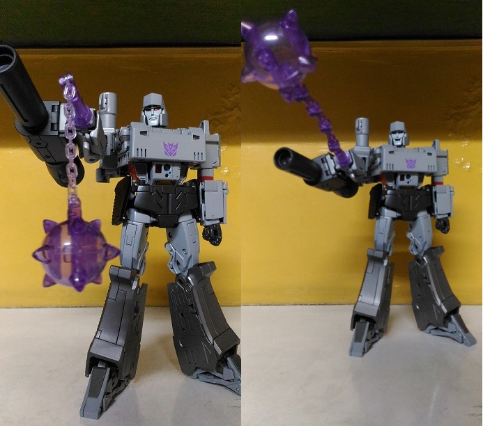 But my favorite accessory for Megatron’s robot mode would have to be the Energy Mace he used in episode 2 of the animated series. Not only does it come with a “standard” laser chain that droops down when its not moving around, you can attach an articulated “chain” with joints on it so you can make Megatron pose with it with some really dramatic poses. If you wanna pose him in a way where it looks like he’s swinging that Energy Mace around, definitely use the articulated “chain.” It really does look good with the right camera angles.