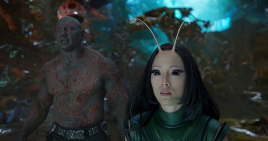 - I love how each of the Guardians characters shows growth as the film progresses; all except Drax, who seems to have experienced his character growth offscreen, in between the two Guardians movies. He is the only one without an arc and his role in the film is to provide the laughs and to play off of Mantis. I understand why; there’s no more room for Drax-specific subplots in this already crowded film. I’m hoping to see more for Drax in the next installment.