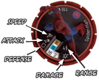 Top view of an old version of the Heroclix dial. Turning the dial will show different numbers for each of Spider-Man’s combat values.