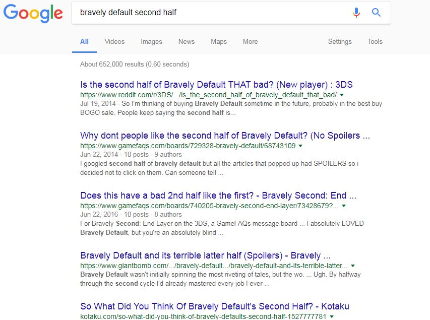 This doesn’t seem like a lot, but there are enough good stuff in these four chapters that should make playing through them worth the repetitive nature. Removing a round of boss fights, I think, should be enough to improve the pacing issues that Bravely Default has. Of course, my recommendation is irrelevant – the game has been made, people have already played it. I wouldn’t want to spoil anyone who is interested in Bravely Default though so if I have any advice to someone who wants to play Bravely Default, I’d probably refer to what that fairy in the game’s introduction said: