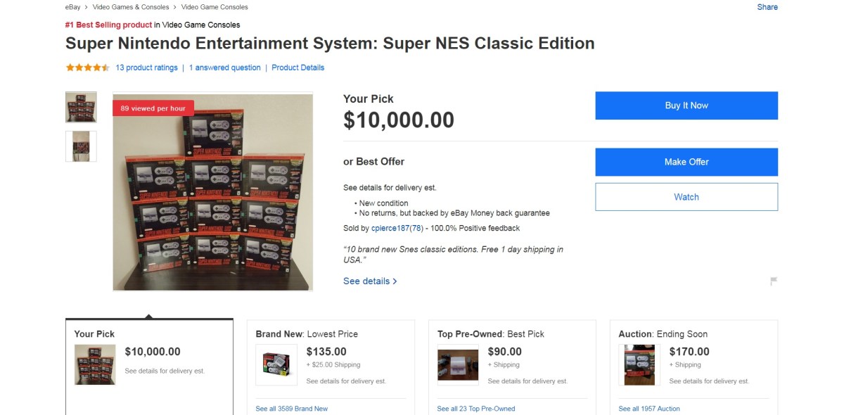 SNES on eBay Published October 1, 2017 at 1895 × 933 in Episode 223: The Disturbing Trend of Nintendo Product Shortages Next → That’ll be $10,000, plus shipping, sir.