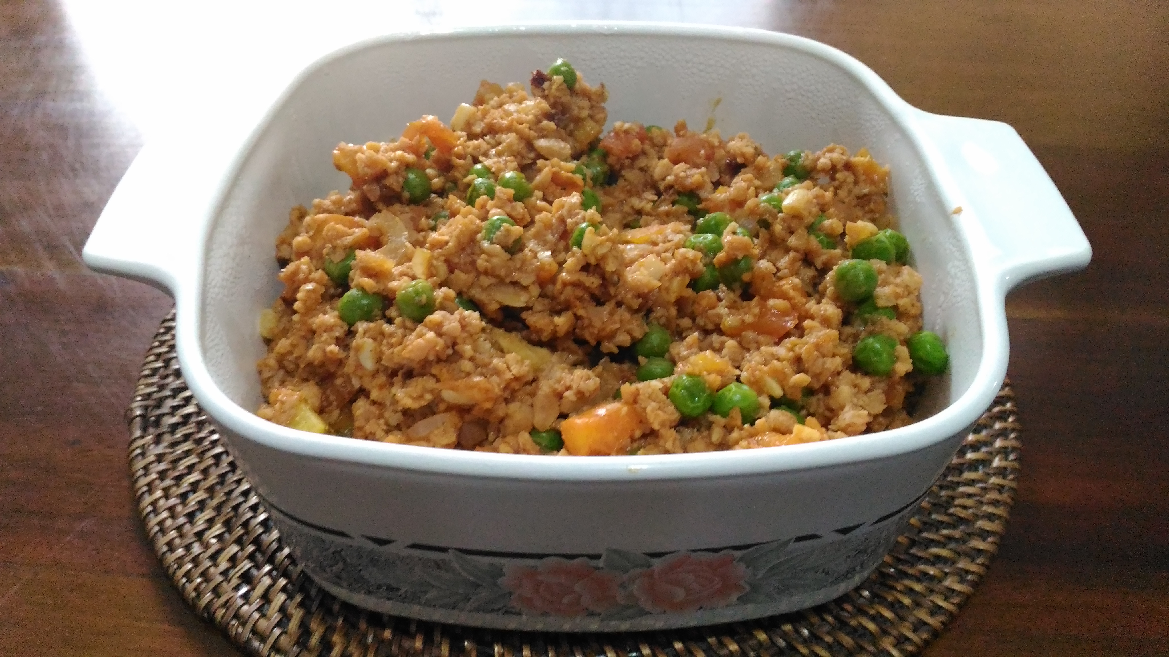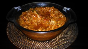 I made my version of vegan chili by frying one minced head of garlic, one chopped large white onion, around a cup of diced tomatoes and a cup of the prepared TVP. I then added the spices, which included cumin, chili powder, cayenne pepper, paprika, oregano, thyme and marjoram. I then added some tomatoes sauce and finished it off with a can of red kidney beans or a small bag of green peas. That’s right, I liked this dish so much I made it two times! Once with beans and a second time with green peas.