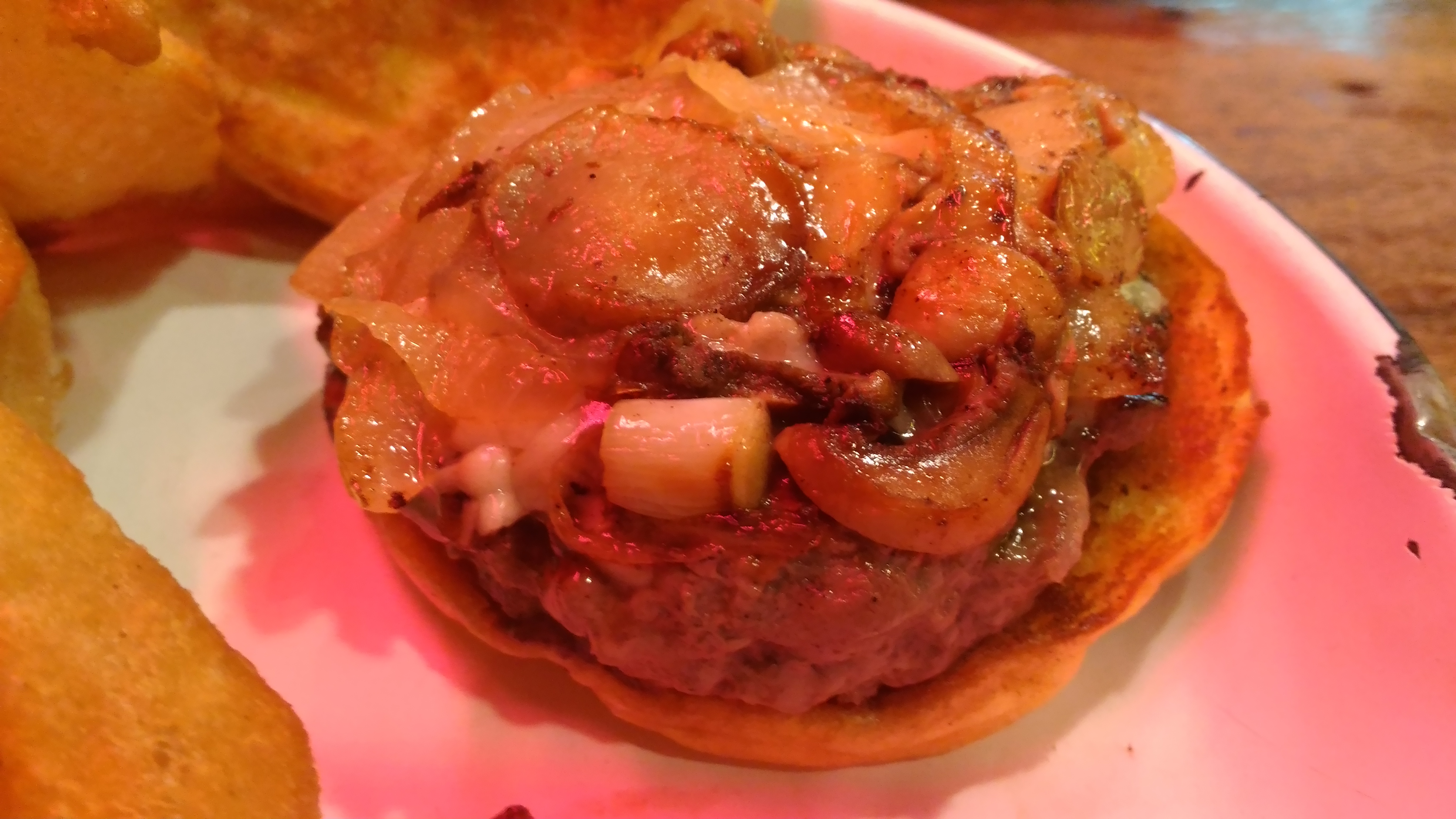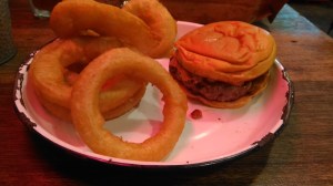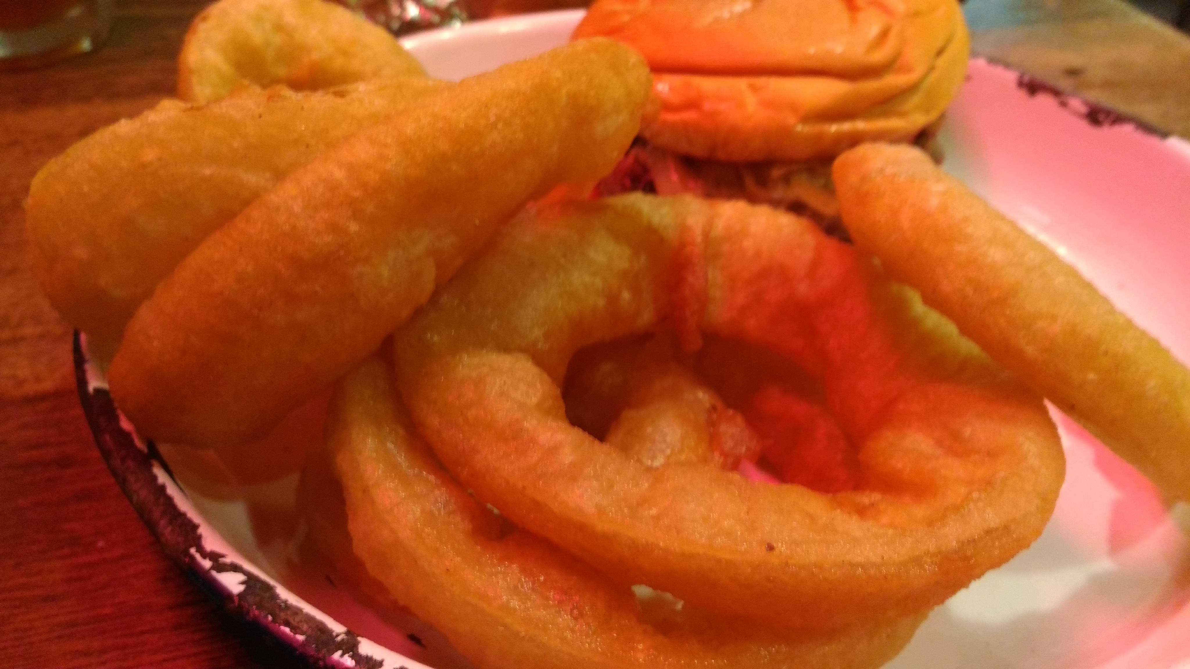 Lazy Bastard’s burger offerings is actually kind of sparse. Despite the sign saying that they have bacon, the only burger that did include bacon was the bacon cheeseburger. As much as I love bacon in my hamburger, it didn’t catch my interest. The thing that did was the Umami Burger as, well, umami is supposed to be a rich flavor and something that will tantalize the taste buds. The Umami Burger doesn’t actually seem to be anything special as it’s a burger topped with cheese, mushrooms and caramelized onions. But if I told you the cheese in the Umami Burger was actually gruyere, a cheese that is a little more flavorful than your typical cheddar or American cheese. This sealed it and, well, it says “umami” in the name! I just had to put the Umami Burger. I also got a side order of onion rings. I generally like onion rings more than fries but only if they’re well made. More on that later.