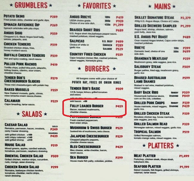 I have eaten at Tender Bob’s before but I usually go there for the steaks (another type of food I thoroughly enjoy binging on if I have the cash to get a good steak). But, as this is Burger Month, I went back there to try the burgers. I looked through their menu and I decided to go get the the most expensive thing on the menu, which is the Fully Loaded burger. Looking at the description, however, I didn’t get what supposedly made the burger “fully loaded.” The menu simply describes it as a burger with bacon, sauteed mushrooms and cheddar cheese.