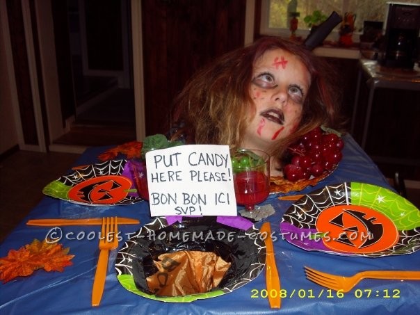 The Head for Dinner is probably one of the more traditional costume you can put together as long as you have the proper stuff lying around. Basically, all you need is something like a box that you can fit inside, a old tablecloth and a paper plate. Simply cut holes in the box, tablecloth and paper plate that would be big enough for your head to fit into. Place the tablecloth over the box and fasten it with something like tape to make sure the tablecloth stays put. Then, you need to put the paper plate over the hole and stick that with tape as well. Make sure the holes are all aligned as that’s where you’ll stick your head out of. You can deck out the Head for Dinner with other stuff, like dining utensils and whatnot. Also, you may want to add some gory makeup on your face.