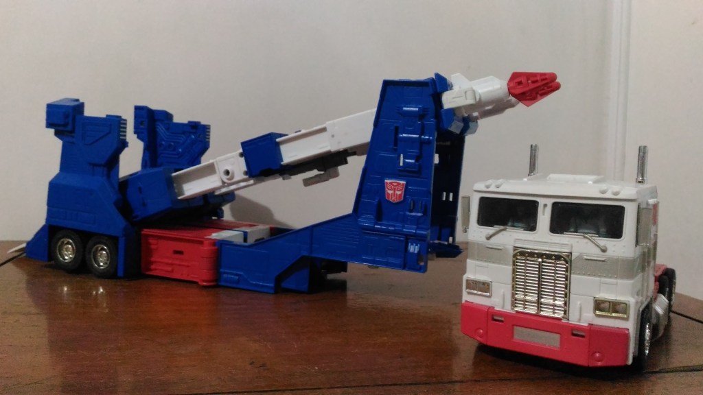 You can do pretty much everything you could do with Ultra Magnus’ vehicle mode with what he could do in the G1 toy. You can unfold a ramp to allow other vehicles to get into the trailer. The top portion also bends downward so you can pretend to load up vehicles from the ground. I say “pretend” because the parts that become the forearms are just too large to allow the top ramp to lay flush on the ground. But, hey! It’s a toy so let’s just imagine it does!