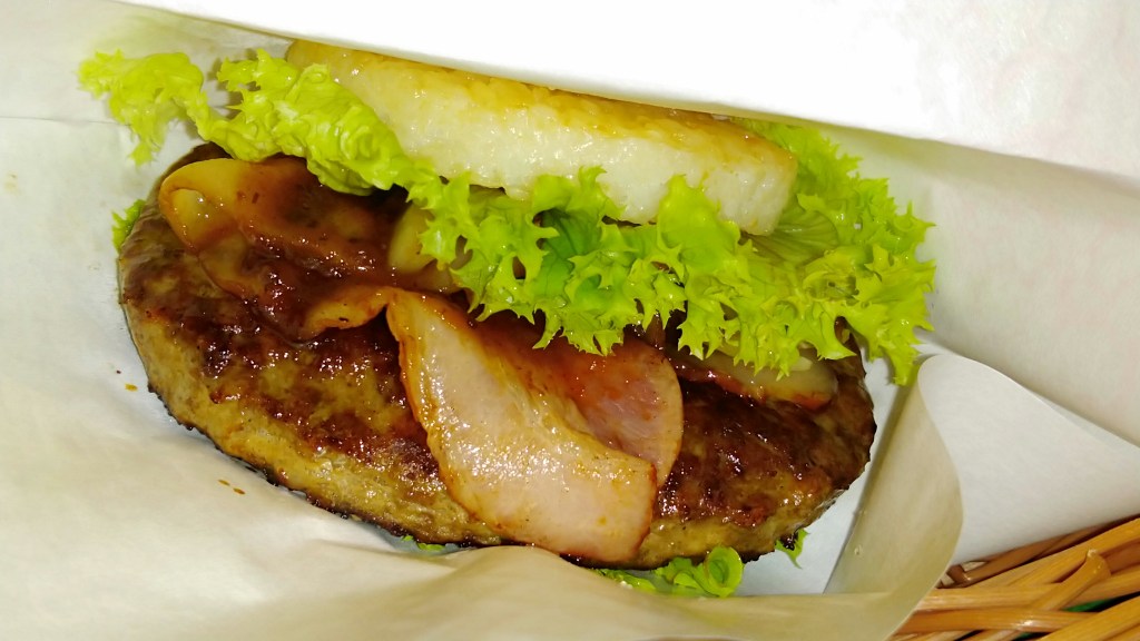 The rice, surprisingly, did kind of work for me but, since the rice buns were small, I really didn’t get much from them. On a side note, while I liked the burger served right after cooking, this may have caused the lettuce to become kind of soggy somewhat as it came off as kind of mealy. Regarding the tongue… I mean, the bacon, I do wish it was much crispier as the texture was more ham than bacon.