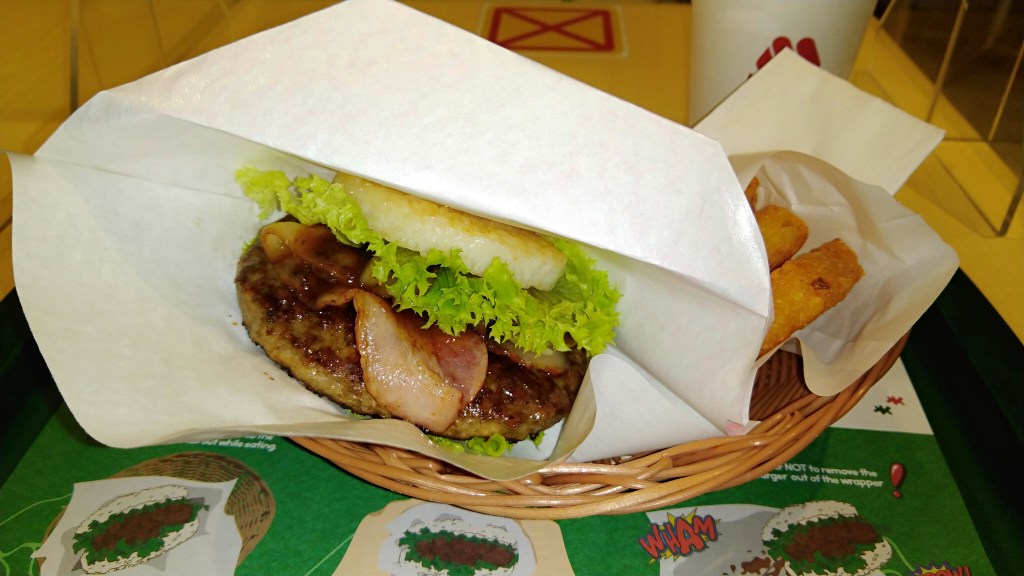 It’s weird, isn’t it? For Burger Month last week, I took a look at Rancho’s Bulalo Burger which, if you’re really a stickler about it, wasn’t a real burger as the meat wasn’t formed in a meat patty. This week, I’m looking at the pretty much the polar opposite. This time around, I checked out a burger that did have a meat patty… but no bun. Instead of a phat burger bun, the burger patty was encased in rice that have been formed to resemble a burger bun… sorta. Well, what do you expect from a Japanese burger franchise like MOS Burger.