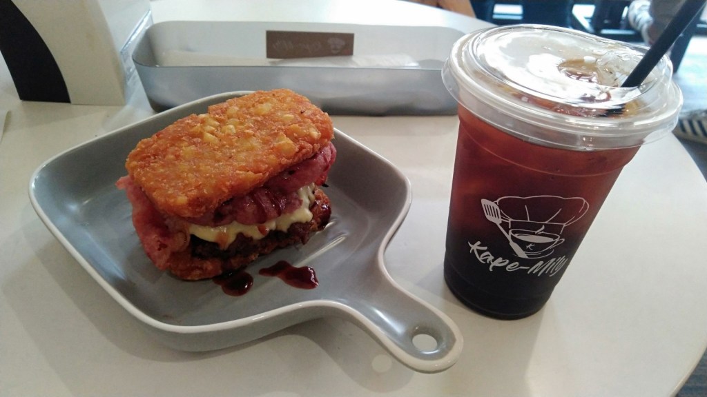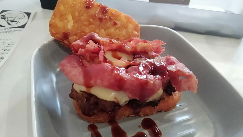 Anyway, I was eagerly awaiting this year’s Burger Month because, like every year, I do a lot of scouting in advance so I already know what places I’m going to visit. I look around and try to see if there’s a new burger joint in town or if some restaurant is carrying a burger that’s unique. Well, Kape-Mily did have something that immediately caught my eye. It’s called the Hashbrown Knockdown and it’s a quarter pound burger with bacon and special sauce. What makes the Hashrbrown Knockdown special is that foregoes the bun and replaces it with two hashbrowns! The instant I heard about this, I wondered why no one else had thought of this before!