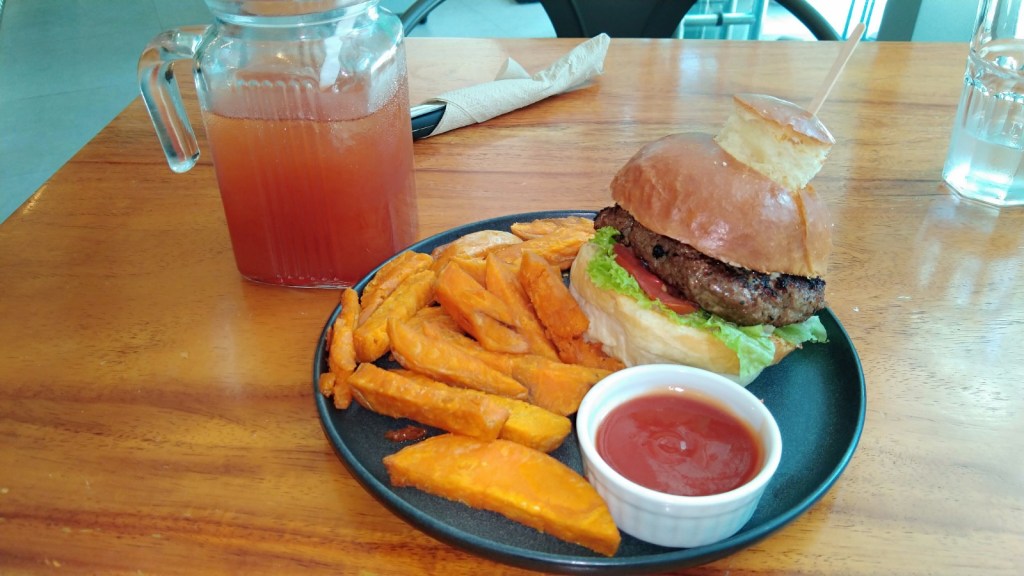 Anyway, as I was looking for a place that did have a burger to fulfill this week’s entry for Burger Month, I did notice Kandle Cafe had a lone entry for the Kandle Burger. They had a lot of other stuff on the menu but this mean Kandle Cafe is more focused on a diverse menu instead of just focusing on one type of food, like burgers. This could be both a good thing or a bad thing. Throwing caution to the wind, I decided to order the Kandle Burger, which did come with a side of kamote fries, the local version of sweet potato fries.