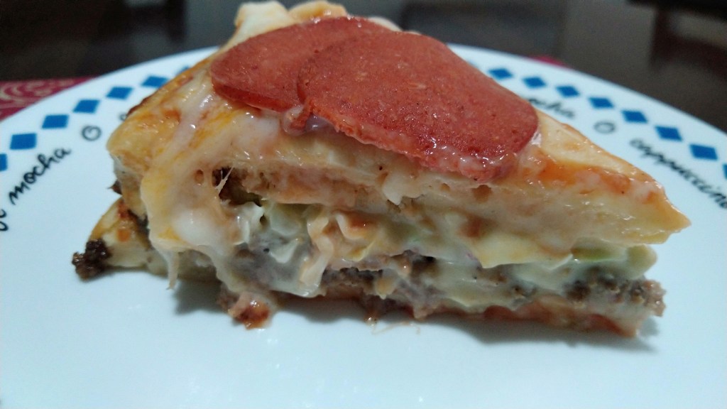 So, the Pepperoni Pizza Burger was okay but I think I made the mistake of trying to eat two slices of it in quick succession. While I was happy with how it tasted during my first slice, my enthusiasm slowly dropped in the middle of my second slice. Sure, it tastes good but it’s pretty tough to eat two slices as, if you do the math, that comes out to around four slices of pizza, the top and the bottom, a whole mess of cheese and around a third pound of ground beef. That’s a lot and, without some kind of contrast to break the flavor monotony and give it more depth, I did feel a little blah afterwards.